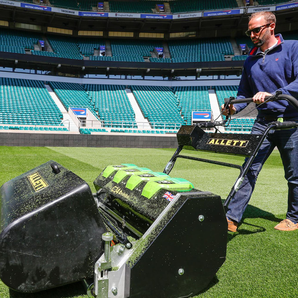 Allett powers into the new age of electric mowers with the C34 Evolution, the large area, walk-behind cylinder mower. The latest Lithium-Ion system battery technology drives the future of mowing systems for sports stadiums, training grounds and prestige lawns, without compromise and with all the attributes of the Allett heritage.