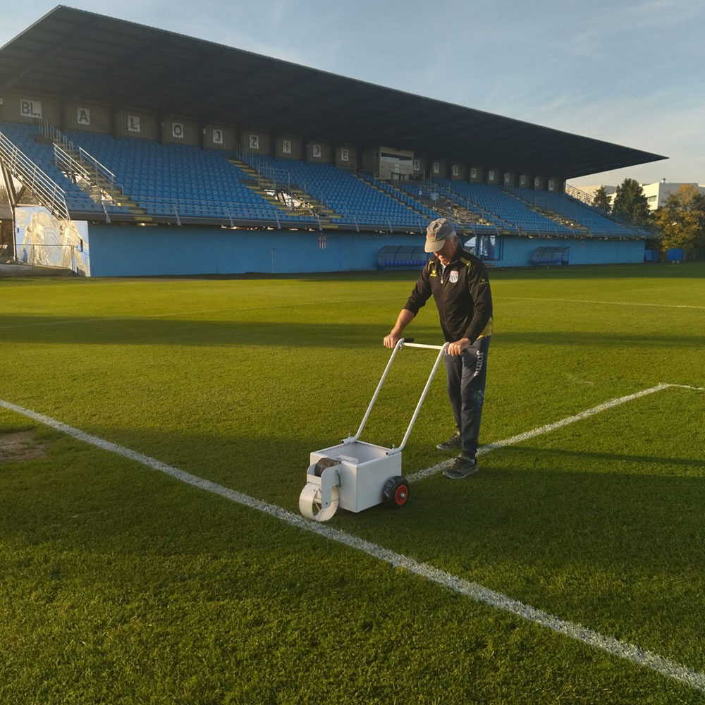 Čvrst i snažan čeličan stroj za iscrtavanje bijelih linija na nogometnim igralištima.  Vrlo jednostavan za uporabu, lako se čisti i održava. Stroj je predviđen za profesionalne i amaterske klubove.
